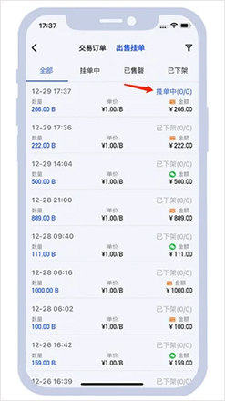 挂单成功后,返回首页点击出售挂单,选择挂单中,点击对应挂单信息进行查看