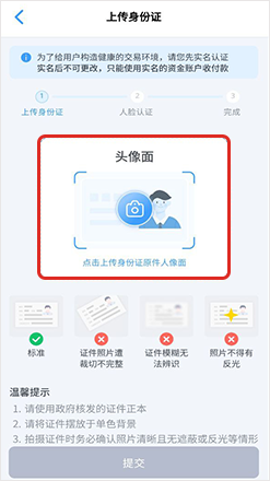 上传本人正面身分证,请进行人脸识别,完成实名认证
