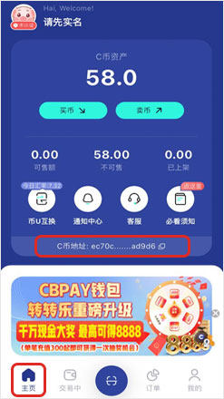 钱包地址可于主页中间,点击后方图标即可复制[C币地址]