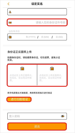填入本人身分号码,上传本人正+反面身分证,进行扫脸验证,完成实名认证