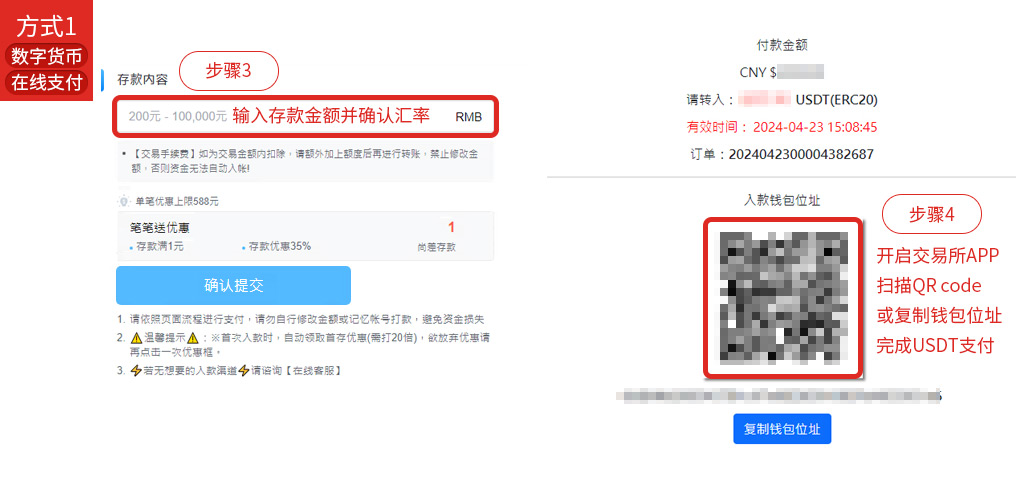 - 选择数字货币或在线支付